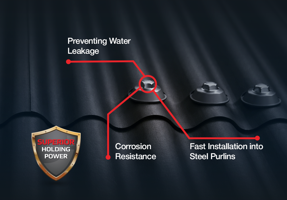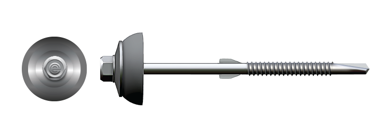 Designed for fixing fibre corrugated (fibre cement) sheets into steel purlins with a sealing-focused build—pilot hole action + dome washer for roofing applications.
