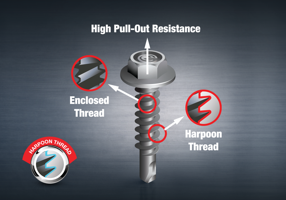 The harpoon thread has sharper angles compared to a normal thread profile, designed for high pull-out resistance and easier installation in light gauge steel.