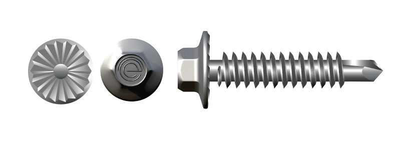 The hex washer flange head provides positive tool engagement and stable seating, supporting consistent fastening on site.
